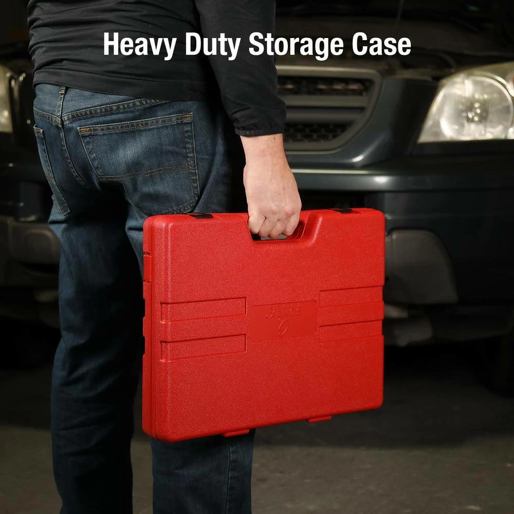 The Sunex 3351 3/8 in. Drive Impact Socket Set includes metric sizes from 7mm to 22mm in standard, deep, and universal lengths. This set includes a universal joint, a 3 in. impact extension, and a ¼ in. bit holder socket. Each socket has been forged from high grade Cr-Mo steel, designed with radius corners, made with chamfered openings, and marked by both laser etching and roll stamping to ensure permanent socket identification. All of this ensures our sockets’ professional-level performance–conveniently stored in one heavy duty storage case. Meets ANSI Standards.