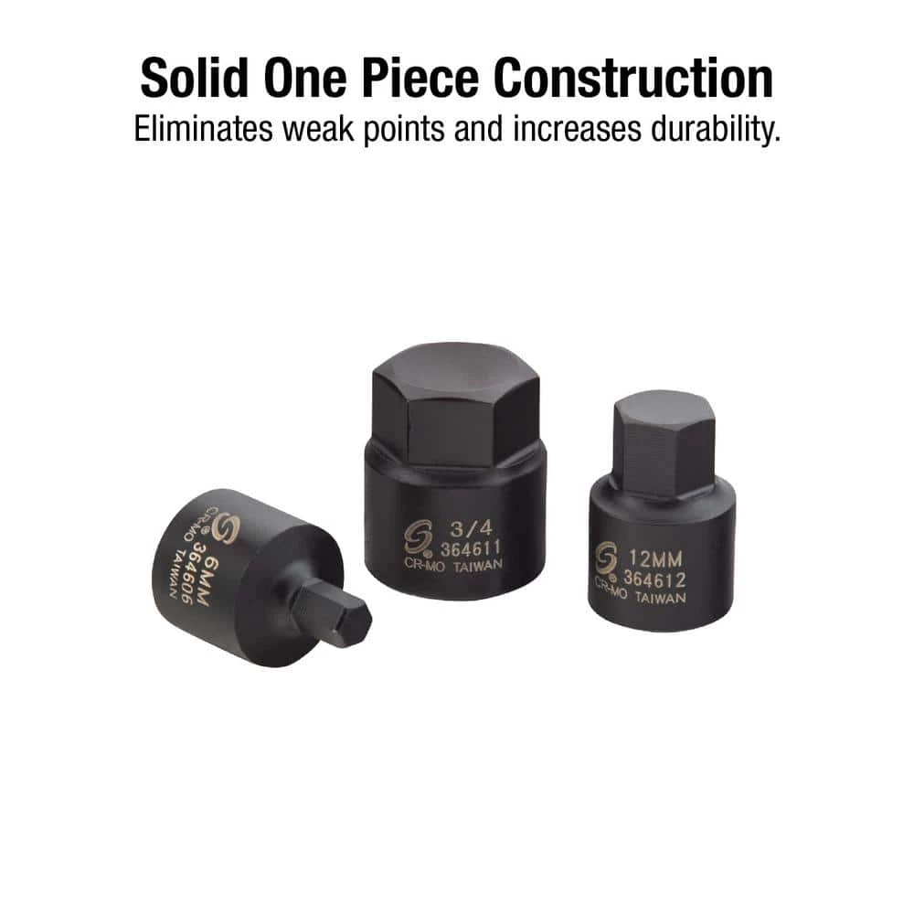 The Sunex 3646 3/8 in. Drive Low Profile Impact Hex Driver Set includes SAE sizes from ยผ in. to ยพ in. and metric sizes from 6mm to 19mm. Each driver has been forged from high grade Cr-Mo steel, constructed as a solid one piece, and marked by both laser etching and roll stamping to ensure permanent socket identification. All of this ensures our drivers’ professional-level performance–conveniently stored in one heavy duty storage case. Meets ANSI Standards.