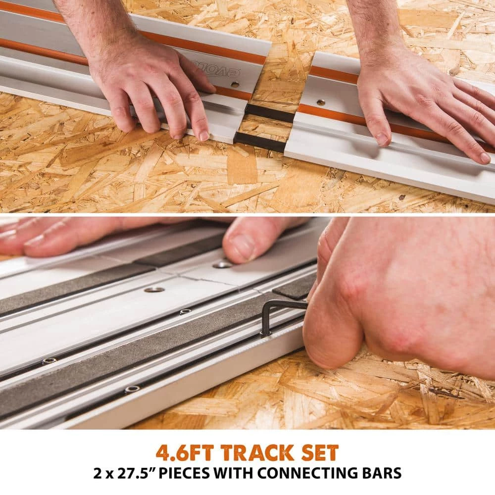 The Evolution ST1400 is a 55 in. circular saw track. Ideal for cutting 4 ft. sheet materials and is made from a strong and sturdy T5 Aluminum Alloy. Supplied in 2-pieces of 2-1/4 ft. track with connectors and easily transported in carry bag that is included. Designed for the Evolution R185CCSX and R185CCSX+ and compatible with most other brands.