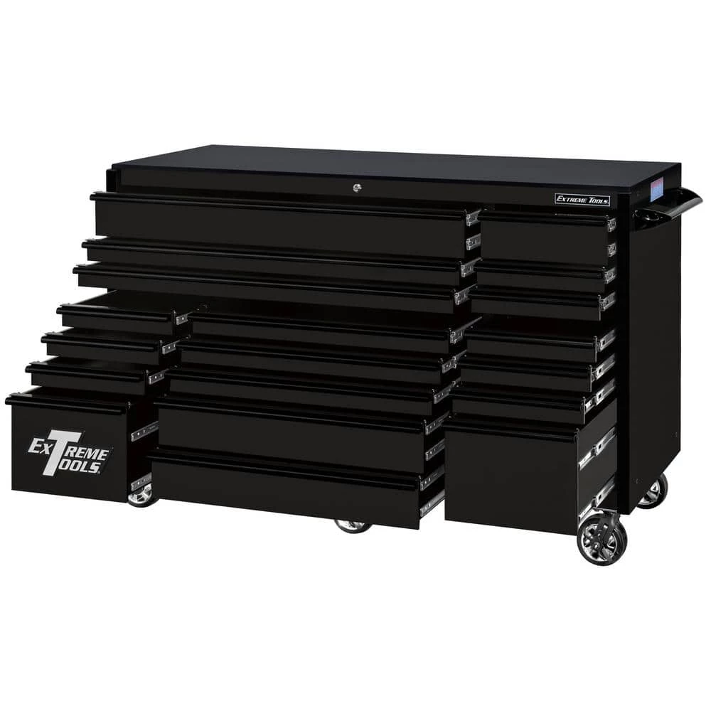 Extreme Tools RX Series RX723019RC 72 in. W x 30 in. D 19-Drawer Roller Cabinet gives you a huge amount of storage as well as the features you want in a professional tool box. This huge roller cabinet features 3 extra-long drawers with additional internal support to provide strength and prevent those big drawers from warping or twisting. Patented self-latching, Quick Release drawer pulls keep drawers securely closed. Each drawer utilizes full-extension ball bearing slides that let you load 250 lbs. to 500 lbs. per drawer (500 lbs. for drawers with double slides.) To keep your tool box looking great, we include heavy-duty PVC drawer liners and a PVC laminated MDF work surface for the top of the tool box. With a super-strong 12-Gauge steel bottom frame and our exclusive 900 lbs. Mag Wheel Casters, you can really load it up with tools. This massive roller cabinet gives you loads of storage space at an affordable price with the assurance of Extreme Tools quality.