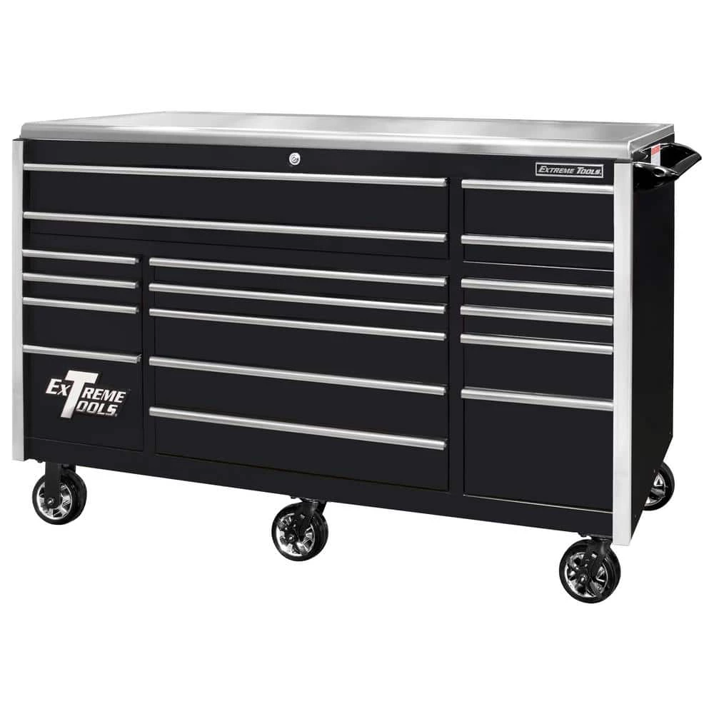 Extreme Tools EX Professional Series EX7217RCQ 72 in.17 Drawer Professional Triple Bank Roller Cabinet with Quick Release self-latching drawer pulls has a MASSIVE amount of storage. Our patented professional self-latching drawer pulls are constructed with all steel and aluminum components – no plastic parts to break or bend. The EX Professional Series includes even more patented and exclusive features which cannot be found anywhere else. From double steel wall drawer fronts to a locking security drawer to an 11 gauge steel frame to 300-600 lbs. drawer capacities and additional drawer support to prevent warping or twisting. We included an industrial grade stainless steel work surface so the top of your tool box stays protected. Whether you have screwdrivers and ratchets or a 48in. pry bar, there is a place for everything. Lock it all up we added a locking safety drawer with a coded tubular lock that will keep your personal items safe and secure.