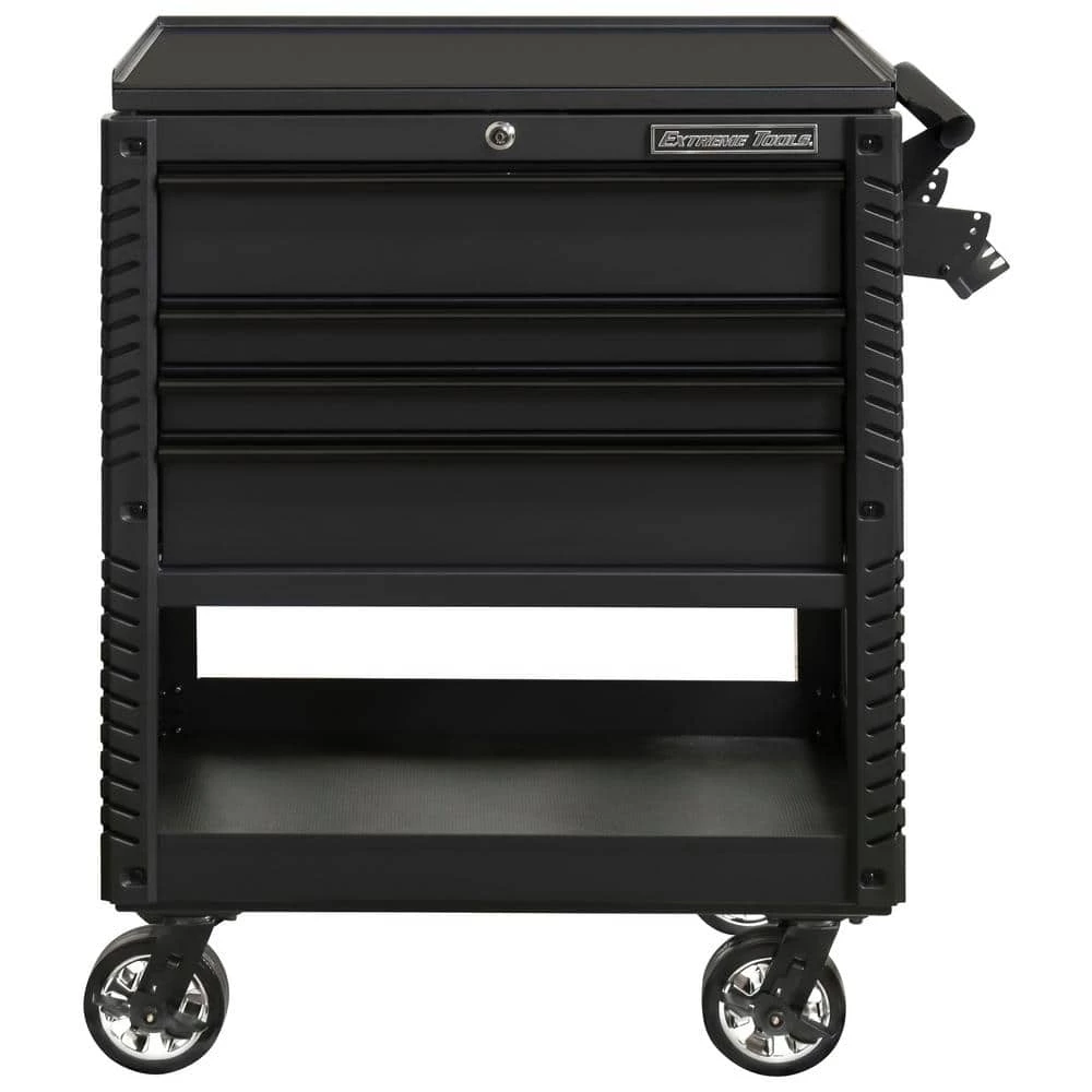 Extreme Tools EX Professional Series 33″ 4 Drawer Deluxe Tool Cart is a heavy-duty professional cart which will hold up through extended use. The most unique feature of this tool cart is the top storage compartment. Open the lid, and you can access all your tools in the top drawer as well as tool hangers/holders on the sides of the cart. The closed lid securely holds a PVC coated MDF top creating a durable work surface and still allows access to the top drawer. It is the most versatile design you will find! Quick Release self-latching anodized extruded aluminum drawer pulls keep drawers closed until you are ready to open them. Heavy-duty ball bearing slides on the drawers are load-rated 100 lbs. per drawer. The cart’s corners are covered in tough, impact-resistant non-marking bumpers to protect the cart as well as objects around it. Four 6″ x 2″ Mag Wheel casters allow you to easily move the tool cart in your workspace. As an added bonus, we have included our Power Tool Rack accessory which hangs off the side of the tool cart and keeps your power tools within easy reach.