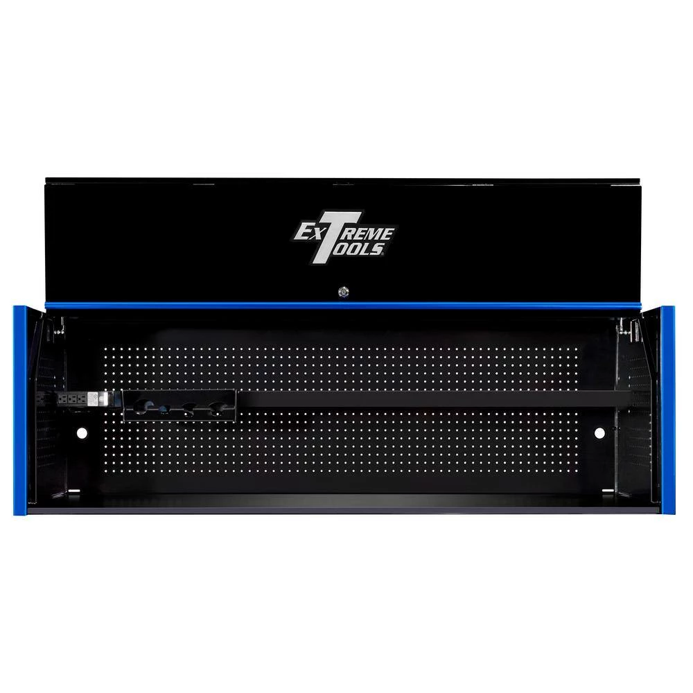 Extreme Tools RX Series RX722501HC 72 in. Extreme Power Workstation Professional Hutch creates a convenient, organized work space in your shop. Our patented hutch includes an adjustable shelf with built-in slots/holes for organizing tools and a power strip housing 3 electrical outlets and 2 USB ports. The specially-engineered shelf is designed to hold removable accessories: Power Tool Rack (included) and optional socket holder, media/electronics stand and universal charging pad. Steel peg board sides and back panel provide a convenient space for hanging tools, hoses, etc. The locking lid has a full-width, polished extruded aluminum handle and is held open with 2 sturdy gas struts. The hutch has a durable, AkzoNobel high gloss powder coat finish to keep it looking great for years to come. Lock it up with a secure, tubular coded lock and keys. Hutch is easily assembled on RX Series 72 in. Roller Cabinet. Includes all Parts/Hardware (see Owner’s Manual), 2 Keys, 3 Outlet/2 USB Port Power Strip, Power Tool Rack accessory.